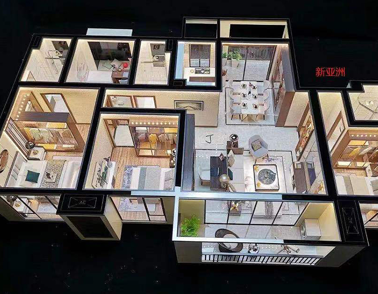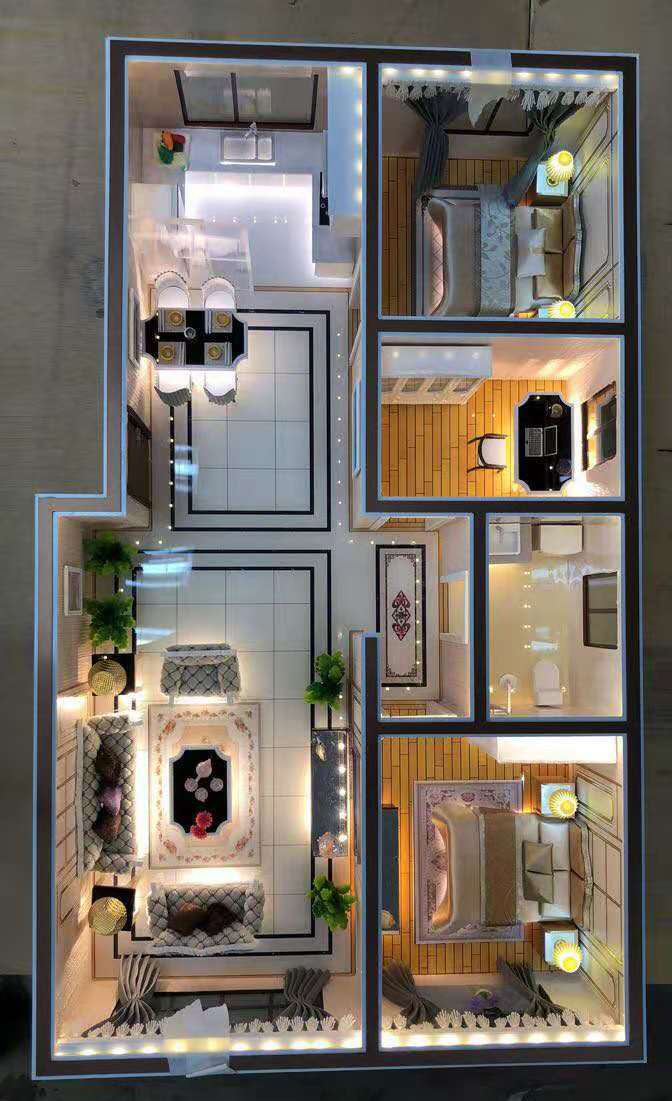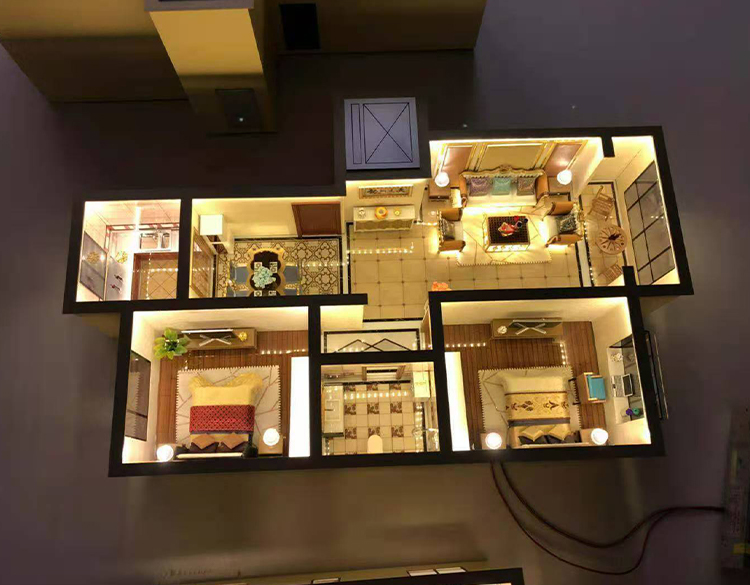 為了更能突出居室內(nèi)部的效果,我們在燈光設(shè)置方面先進(jìn)的科技技術(shù),通過實(shí)際的局部設(shè)計(jì)壁燈、落地?zé)簟⒋差^燈、水晶吊燈等表現(xiàn)出來并能發(fā)光,通過戶內(nèi)的裝飾效果與燈光效果相襯托,把整個(gè)剖面模型的居家氣氛表現(xiàn)出來。為了更好營造模型采用進(jìn)口材料和裝飾品,并且能夠以歐式、美式等不同裝修風(fēng)格呈現(xiàn),打造出戶型的獨(dú)特風(fēng)韻。